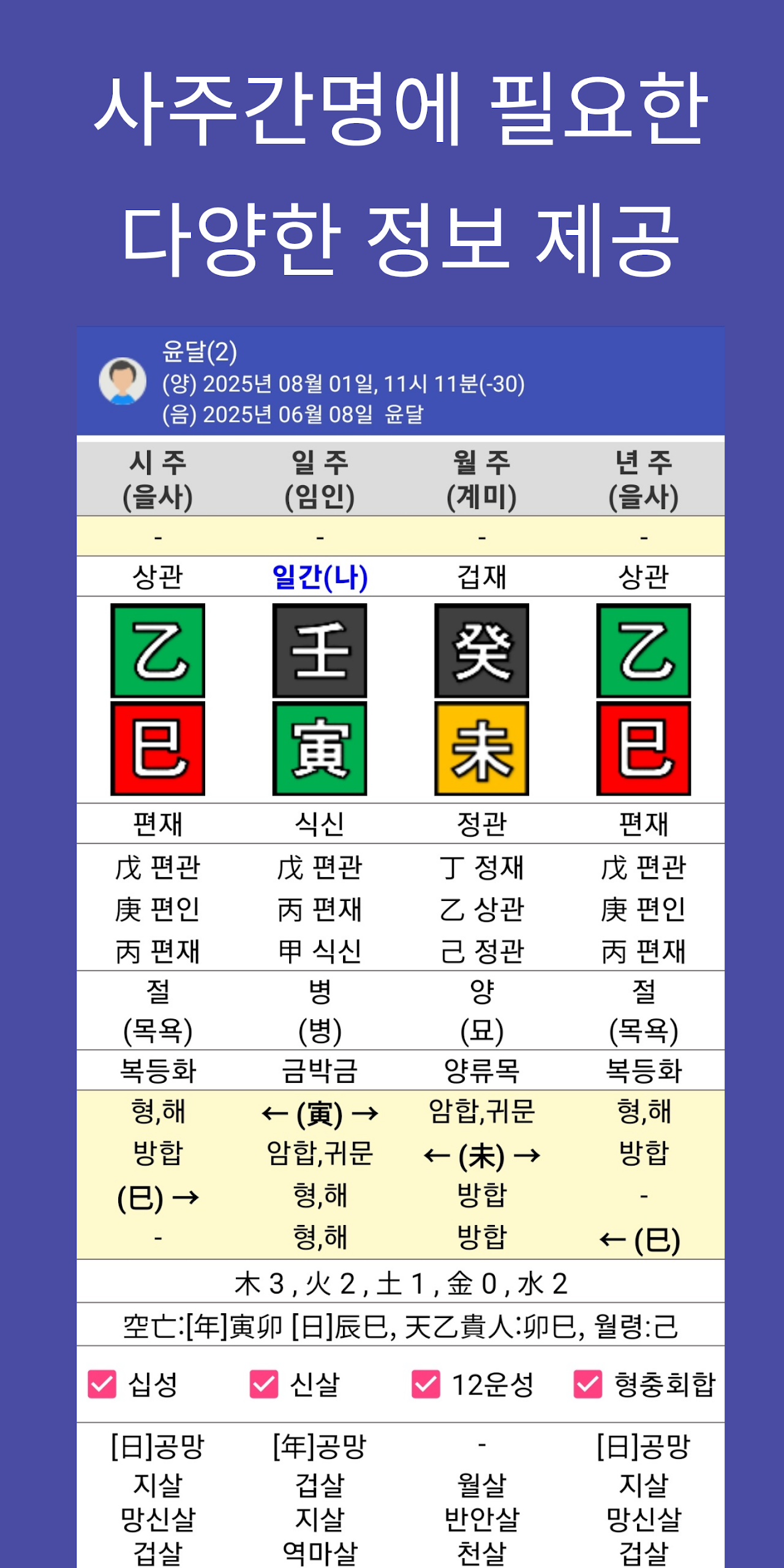 - 간결한 사용자 인터페이스: 방대한 사주 정보를 누구나 쉽게 확인할 수 있도록 직관적인 화면 구성과 깔끔한 디자인을 적용했습니다. 필요한 정보가 한 화면에 정리되어 있어 복잡한 메뉴 이동 없이 빠르게 확인할 수 있으며, 초보자도 부담 없이 사용할 수 있습니다.